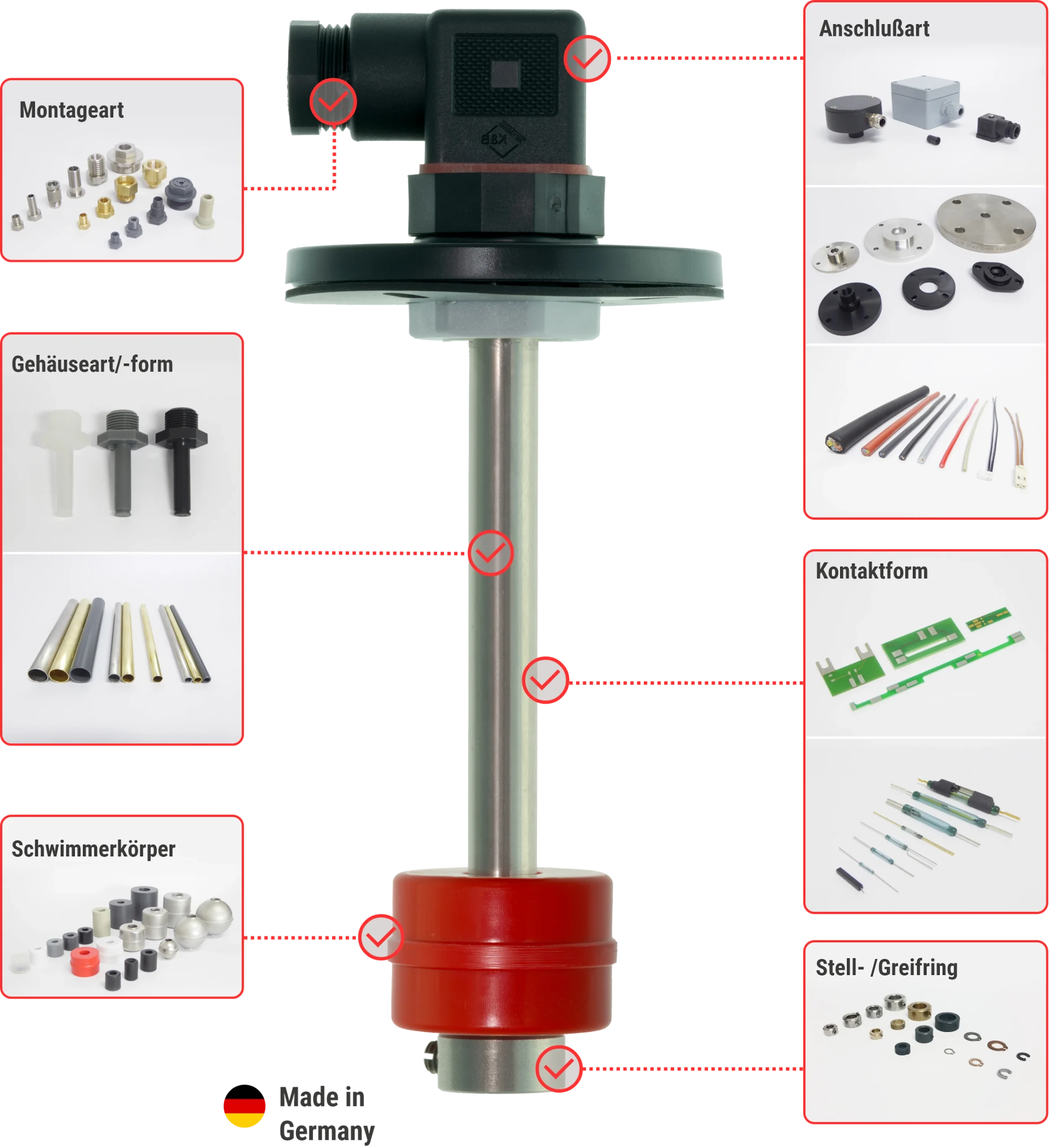 Ob Einbaulage, Material, Kontaktform oder Anschlussart – mit unserem Baukastensystem passen Sie jeden Miniatur-Schwimmerschalter exakt an Ihre Anforderungen an.