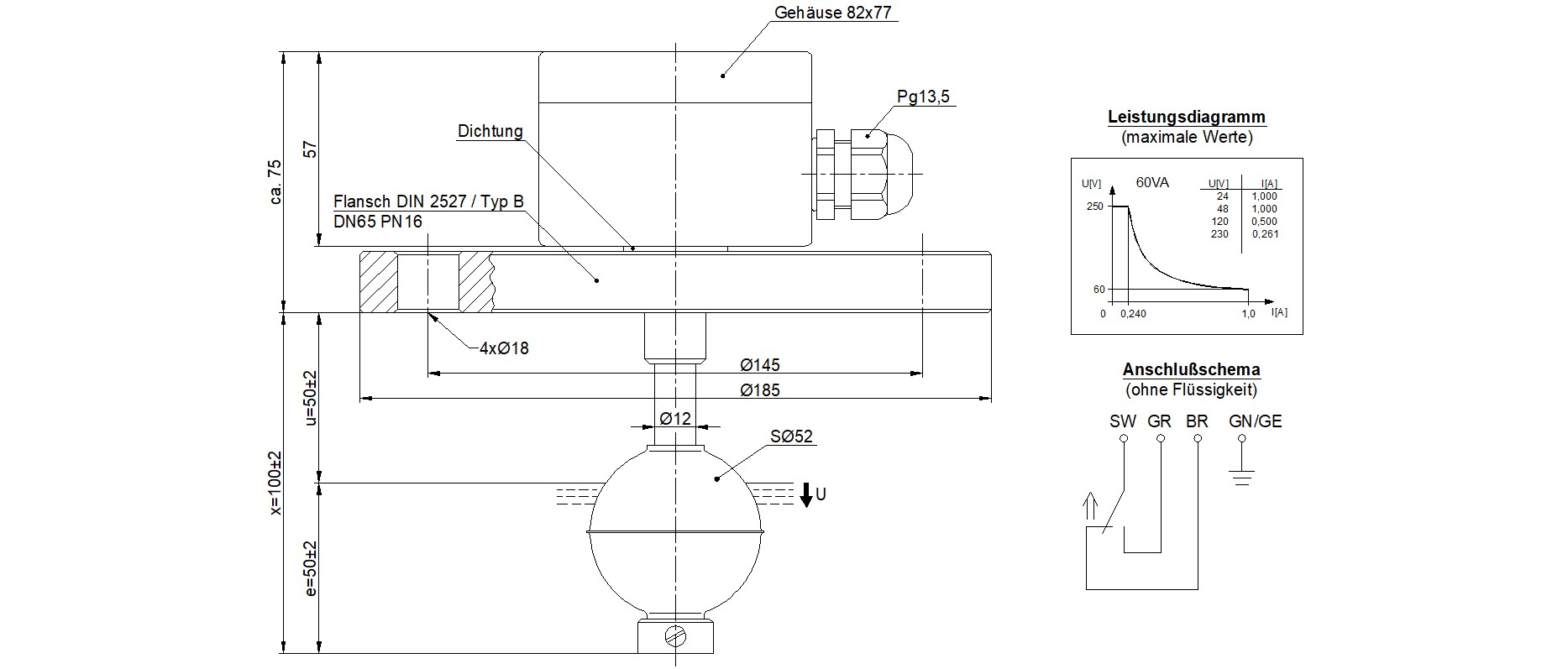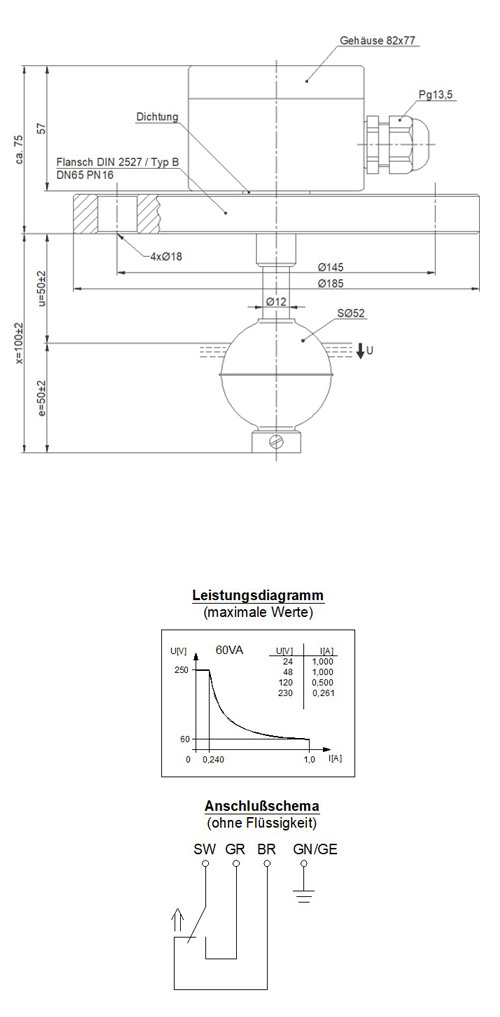 Dieser Standard-Schwimmerschalter mit Ø12 mm Schaltrohr ist für den Einsatz in industriellen Anlagen vorgesehen, in denen korrosionsbeständige Materialien und erhöhte mechanische Belastbarkeit gefordert sind. Gehäuse und Schwimmer bestehen vollständig aus Edelstahl 1.4571, wodurch der Sensor zuverlässig in anspruchsvollen Flüssigkeiten und unter erhöhtem Betriebsdruck eingesetzt werden kann. Die präzise Reed-Technik arbeitet ohne Dauerstrom und ermöglicht eine langlebige, störungsarme Grenzstandserfassung. Die vertikale Installation erfolgt über einen genormten DIN-2527 Typ B Flansch (DN65, PN16), der eine sichere und dichte Außenmontage gewährleistet.