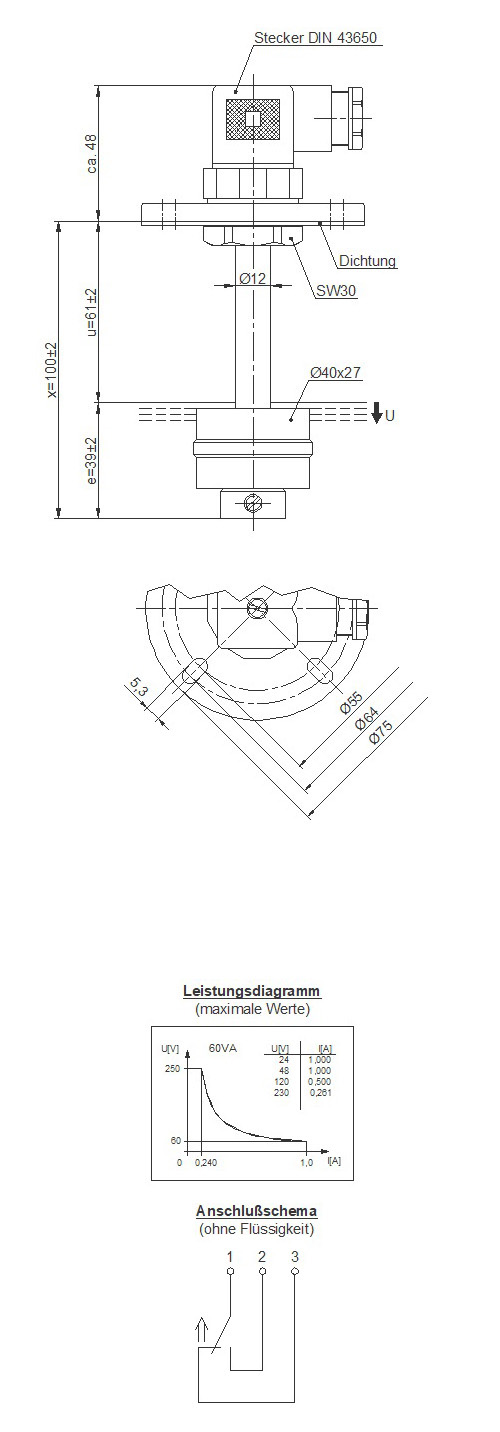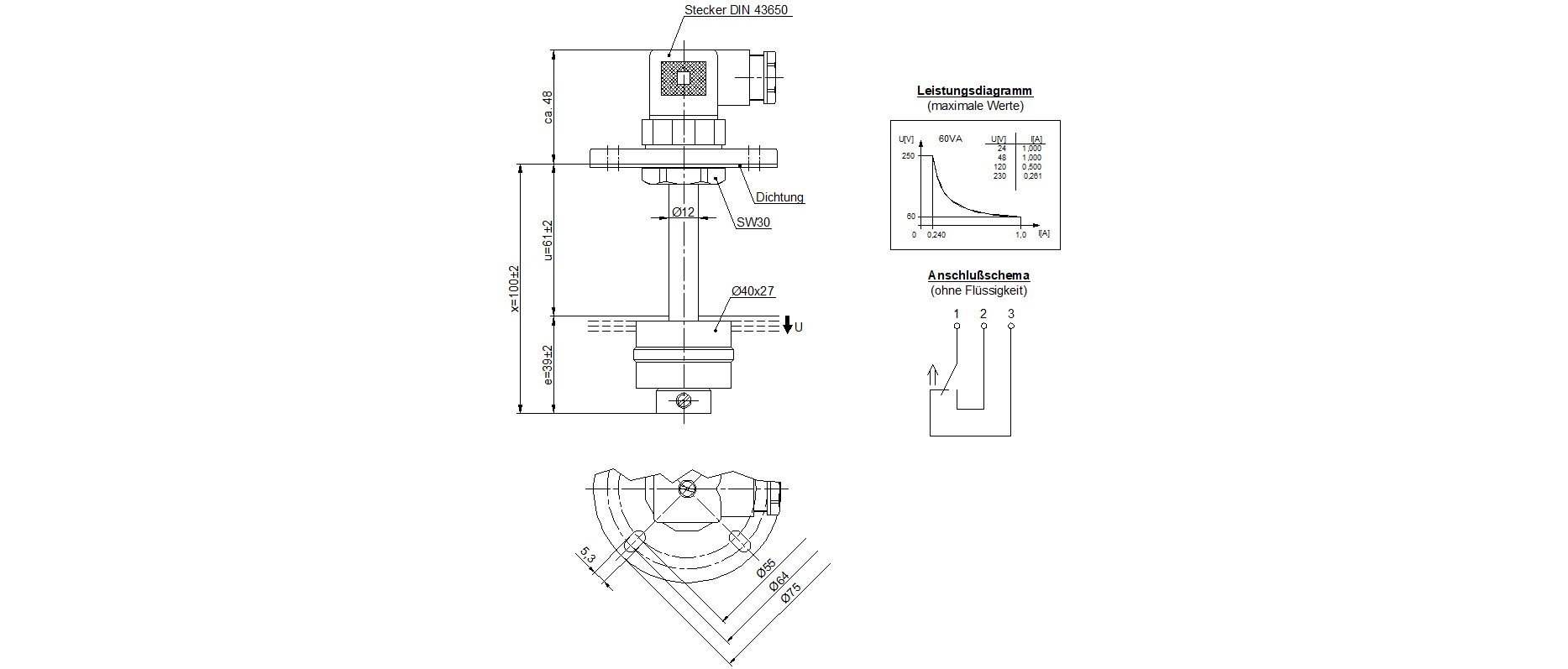 Dieser Standard-Schwimmerschalter mit Ø12 mm Schaltrohr wurde für industrielle Anwendungen entwickelt, in denen zuverlässige Schaltpunkte und robuste Materialien erforderlich sind. Das Gehäuse aus Edelstahl 1.4571 bietet hohe Beständigkeit gegenüber korrosiven Medien, während der POM-Schwimmer sich ideal für saubere, neutrale Flüssigkeiten eignet. Die bewährte Reed-Technik arbeitet ohne Dauerstrom und ermöglicht eine präzise, langlebige Grenzstandserfassung. Die vertikale Installation erfolgt über einen stabilen D75-Flansch von außen, während der genormte DIN-43650-Stecker eine schnelle und sichere elektrische Integration ermöglicht.